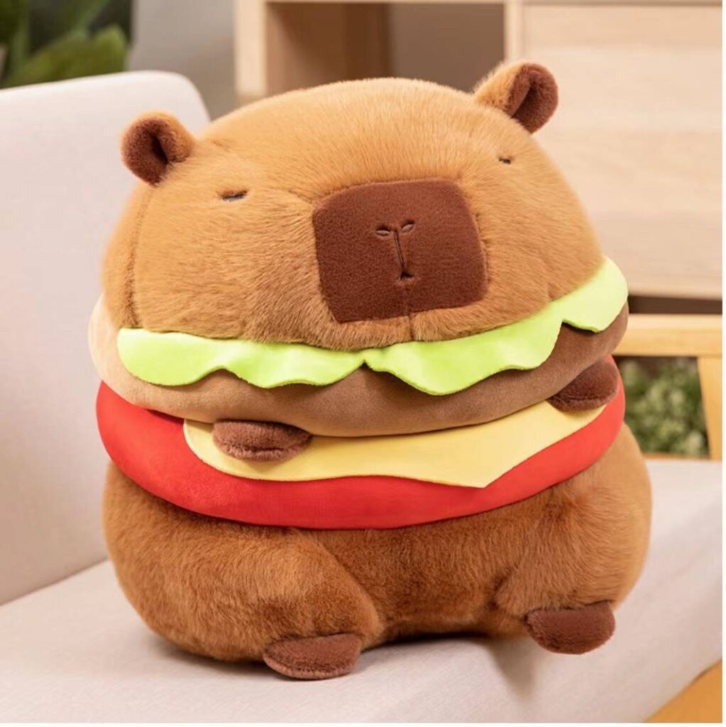 把水豚變成一份超萌漢堡,創意造型一眼吸睛。柔軟好抱,既是玩偶也是空間中的療癒擺飾。
